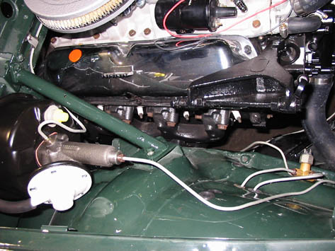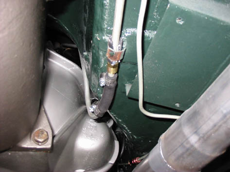 Fuel line routes up rear of engine to avoid exhaust heat problems of factory routing.