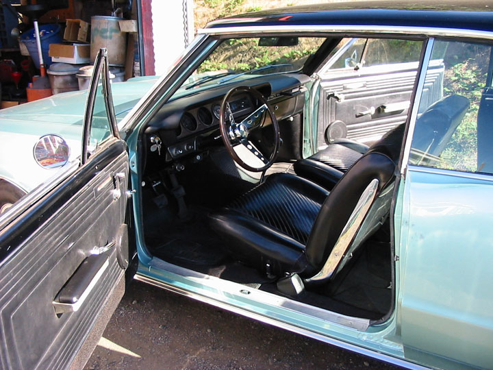 INTERIOR AND TRUNK- The interior is original and clean. The headliner was just replaced with original style liner. The dash has the stock wood veneer and original guages. The trunk was sprayed with correct gray spatter paint and is lined with a new original mat.