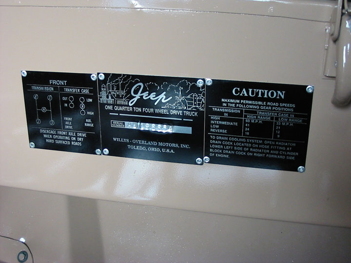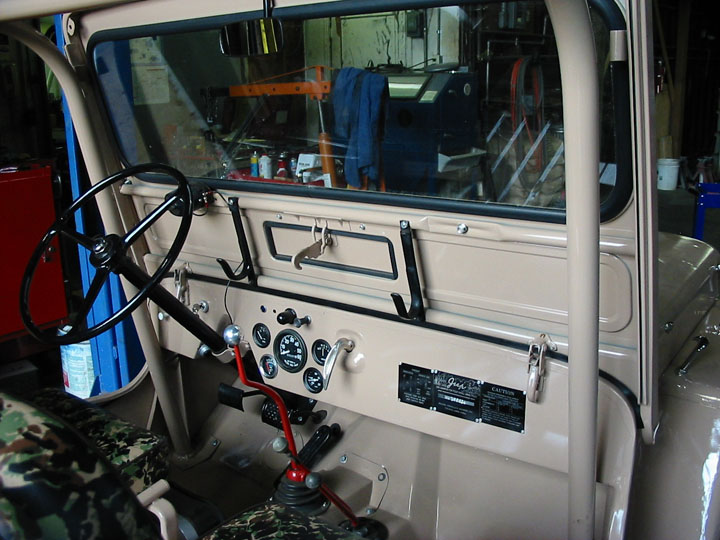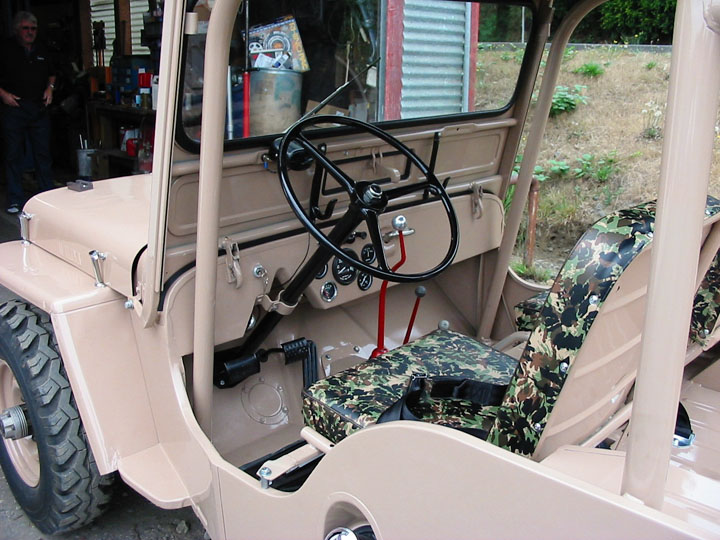 INTERIOR- New steering wheel, factory gauges, windshield and seal. Winshield frame is CJ3A with open and close air vent. Original seat frames refinished with body paint then padded with camo-vinyl. Roll cage included with fire extinguisher. Gun rack installed. New reproduction data plates.
