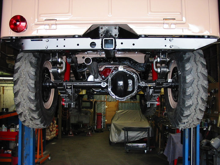 SUSPENSION- New front and rear springs, hangers, and frame supports. Dana 44 front and rear differentials with 11 inch brakes. Warn Rear Lock-in-lock-out hub conversion. Period Warn hubs on front. Brake system is completely new: Master cylinder, lines, hoses, wheel cylinders, shoes, and drums. New wheel bearings front and rear. Steel rims finished with body color and new "mudder" tires and tubes. New Front and Rear bumpers. Rear bumper has custom hitch receiver. Front setup with removable tow bar.