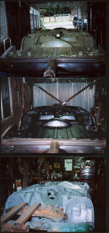 From top to bottom: Epoxy primer, rubberized undercoating over seam sealer, primer/sealer, finished in Light Wedgewood Blue Metallic.