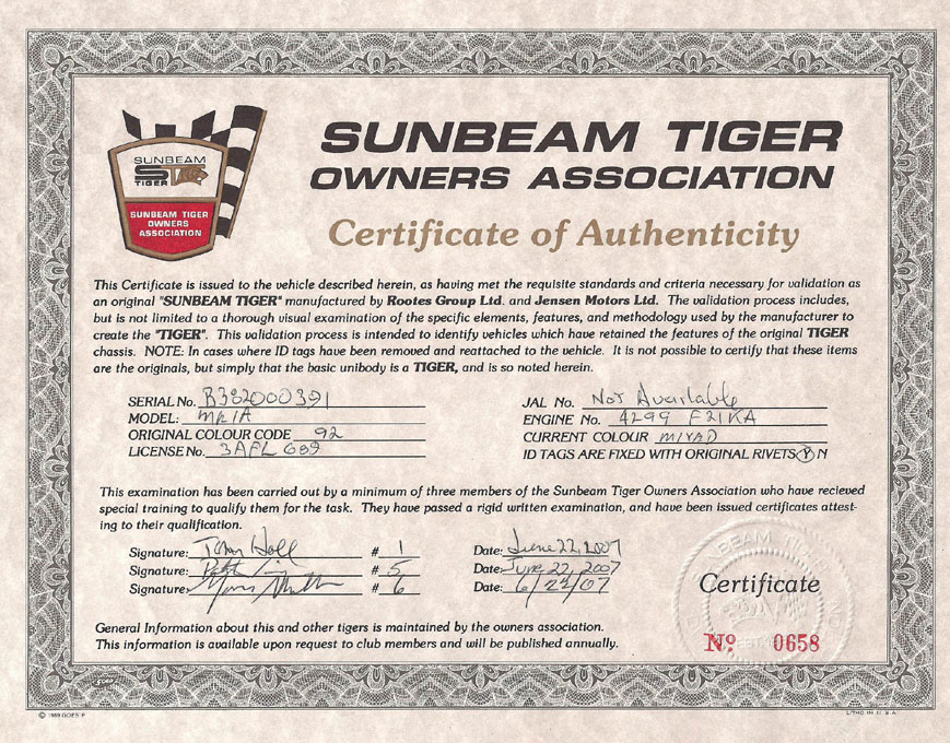 Tiger Authentication Sticker and Certificate