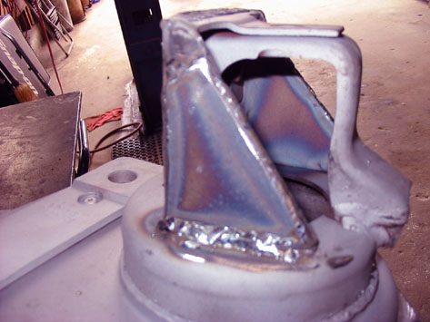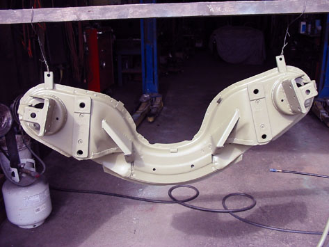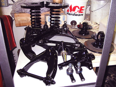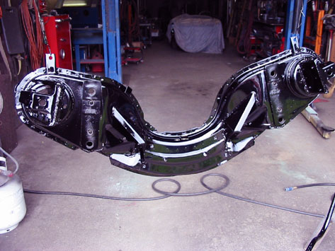 Misc. assembly and paint. Shock towers strengthened with plates welded to the upper a-arm towers. All welds were inspected and rewelded if failure was showing or suspect. Painted with epoxy primer, automotive primer-sealer, finished with catalyzed black enamel. Steering rack reconditoned.